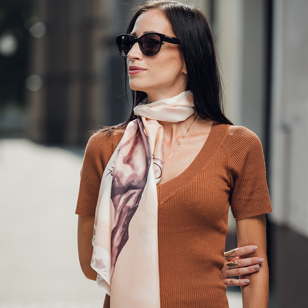 -klasická šatka okolo krku – vďaka vlastnostiam hodvábu je vhodné nosenie celoročne
